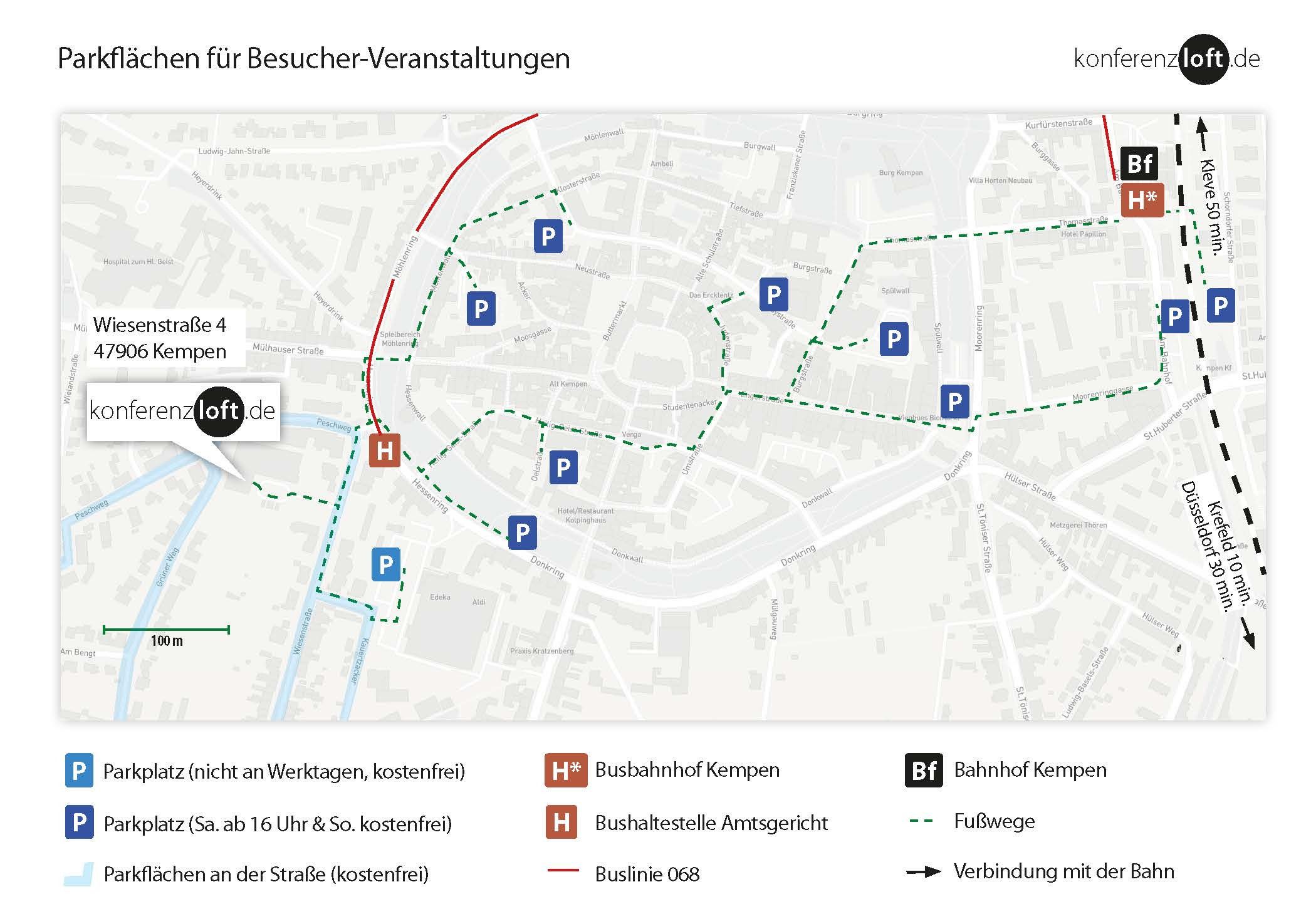 Die zentral gelegene Location liegt etwa 30 Minuten vom Großraum Düsseldorf entfernt und ist über die Autobahnen A40, A44, A57 und A61 zu erreichen. Unten steht eine Übersicht der Parkplätze, die fußläufig nur zwischen 3 und 5 Minuten entfernt sowie zentral gelegen sind.